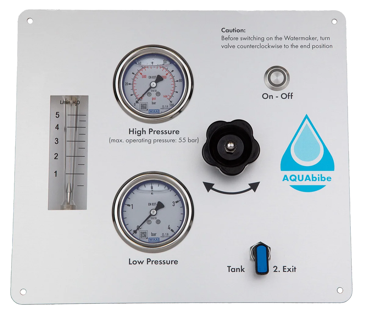 - Bedienpanel mit 12V-DC-Steuerspannung, 2 Manometer (Vordruck & Hochdruck) sowie Umschaltung zwischen Tank und einem zweiten Frischwasserauslass, Druckregelventil sowie Ein-Aus-Schalter.